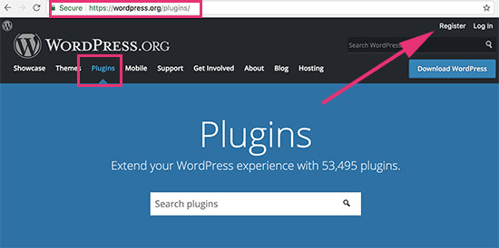 Por ejemplo, en este tutorial dice: “Primero necesitarás una cuenta gratuita de WordPress.org. Ve a la página del directorio de plugins o temas de WordPress.org y haz clic en el enlace ‘Registrarse’ en la esquina superior derecha de la pantalla”.