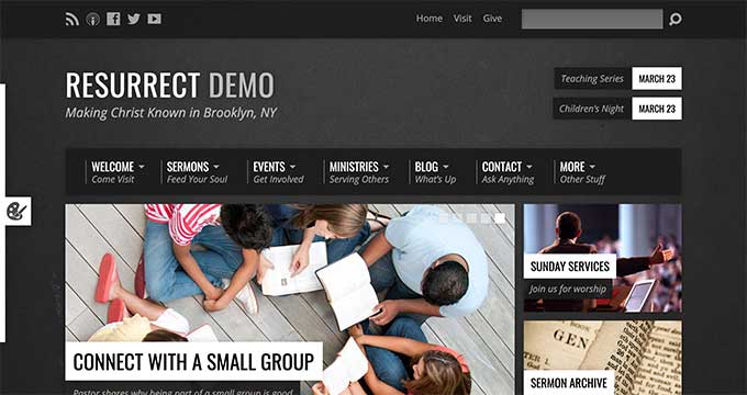 Resurrect to inspirowany miejskim stylem motyw WordPress dla kościołów. Posiada własną sekcję kazań, która pozwala na przesyłanie kazań w wielu formatach.